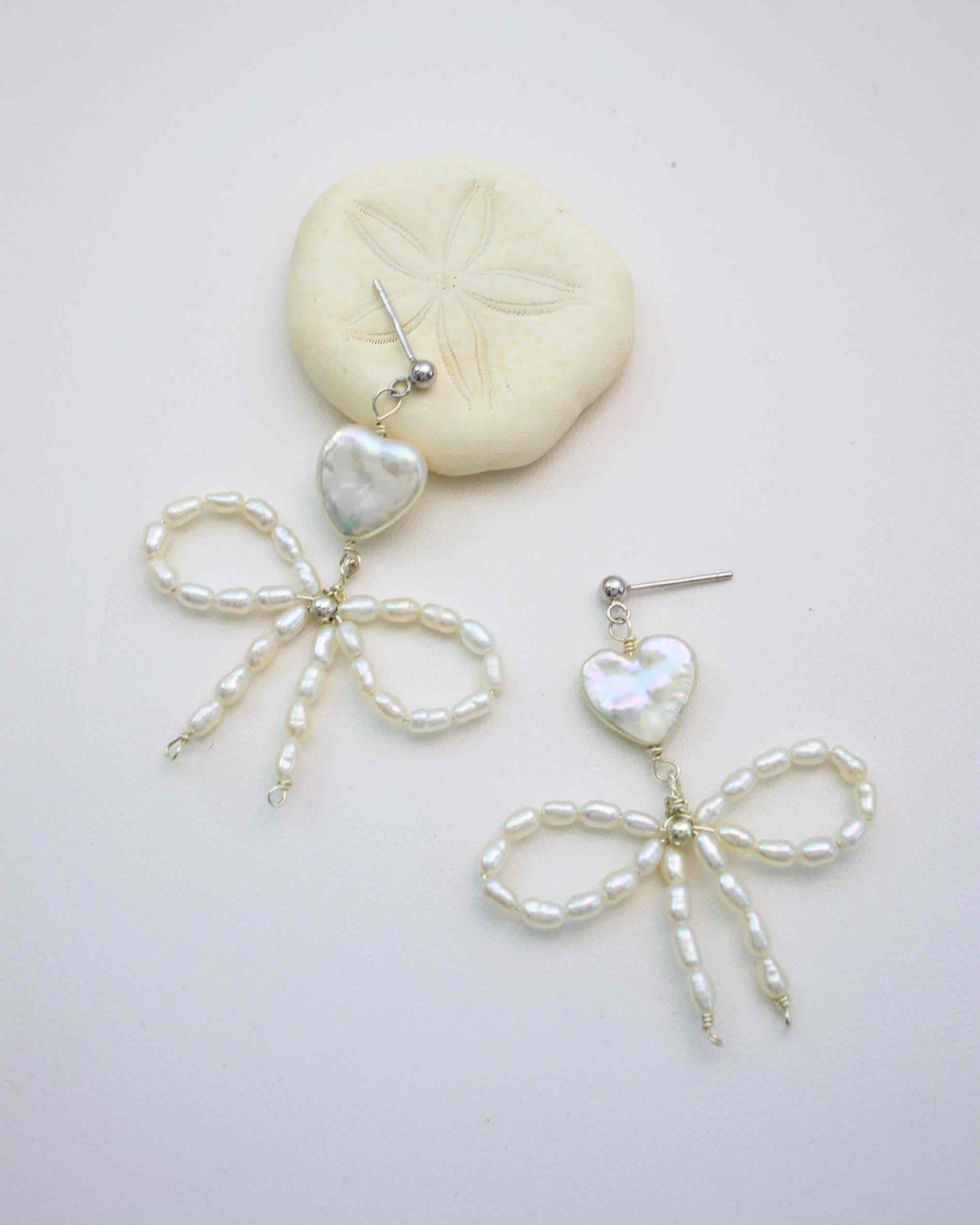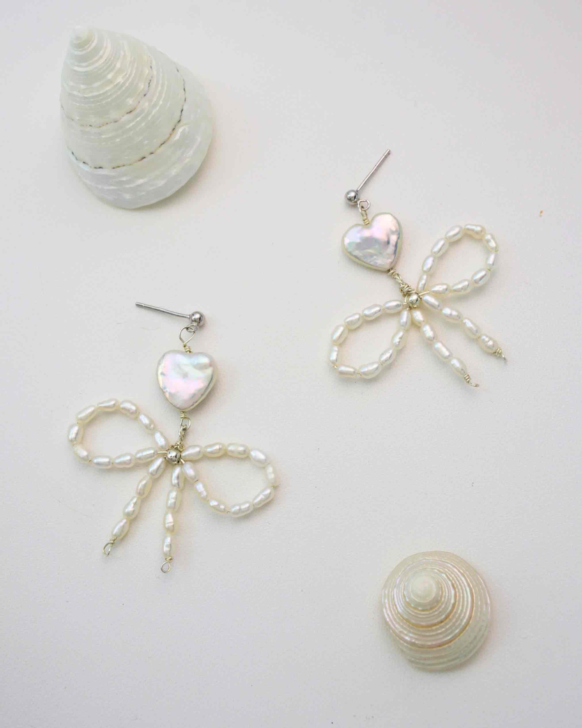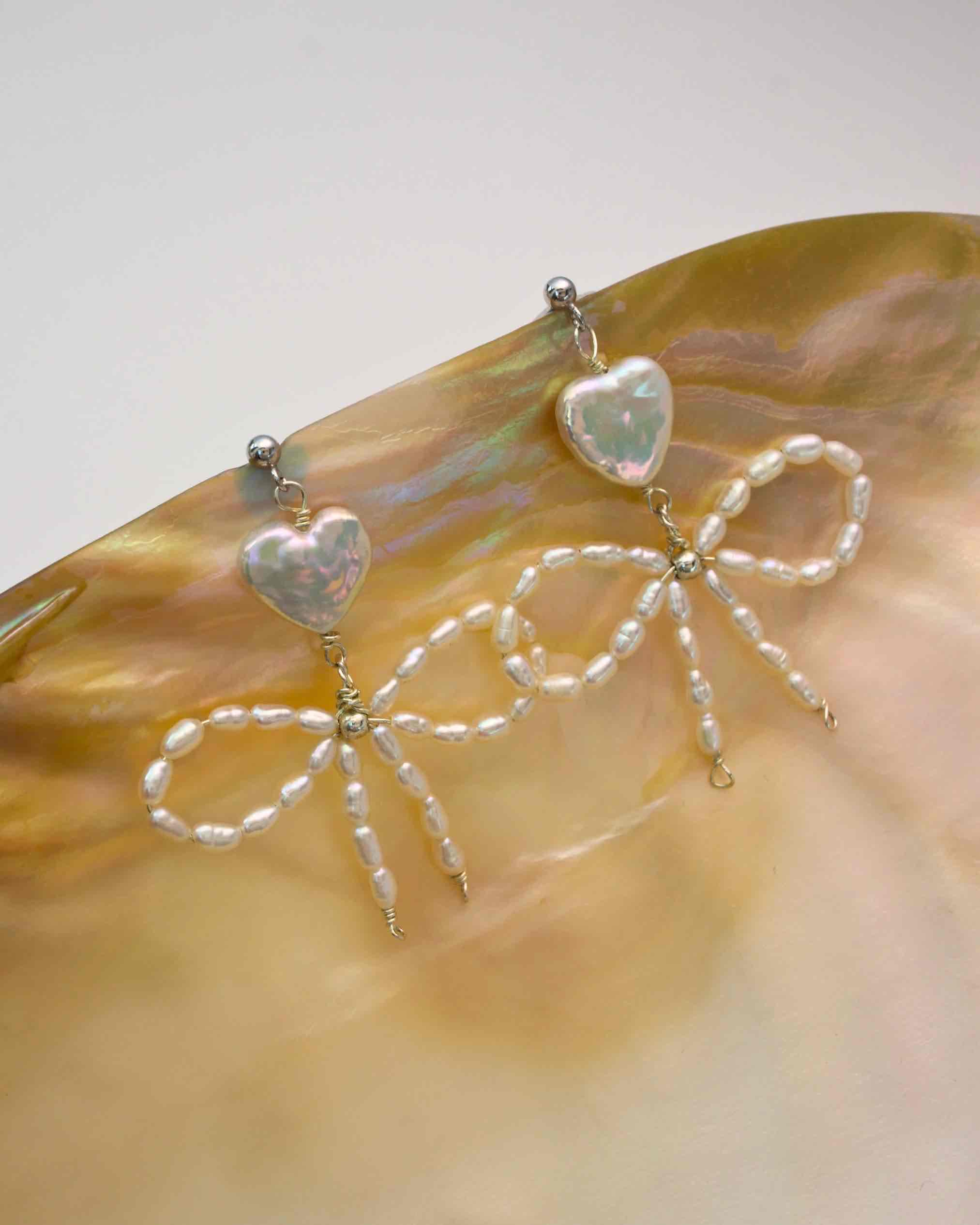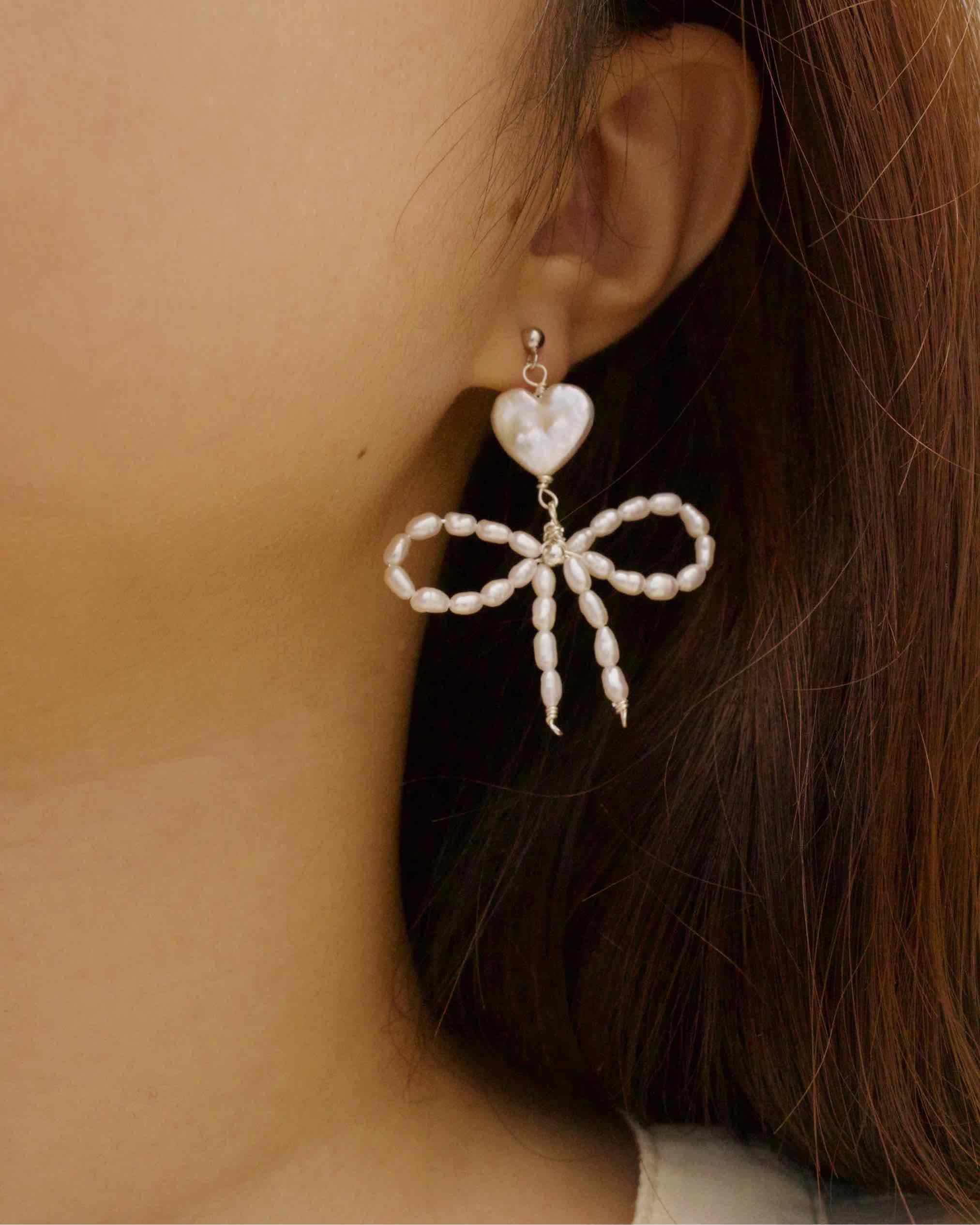 Radiate charm with the Amelia Pearl Bow Earrings, where handpicked heart-shaped natural freshwater pearls meet delicate strings of larger pearls crafted into a striking bow design. Set with hypoallergenic 925 sterling silver, these statement-making earrings blend sweet elegance with bold, unique flair. Perfect for standing out at casual outings or stealing the show at special occasions.